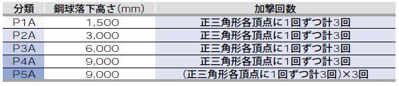 ⑤上記高さ・回数で実施し、3供試体全てにおいて鋼球がつき抜けなかったとき、その分類に合格したとみなされる。
