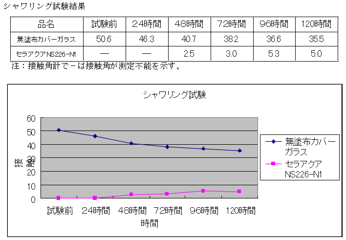 下記にセラアクアNS226-N1をコートした太陽電池カバーガラスの接触角の変化を示します。