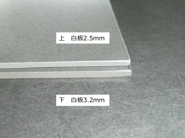 当然のことですが 白板ガラス2.5mmと3.2mmの印象はやはり2.5mmは持った感じで軽いです。