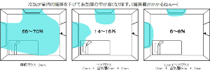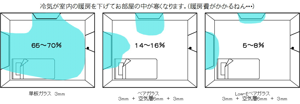 | ガラス比較(室外の冷気が、窓ガラスを通じて室内の温度を下げる様子) | |